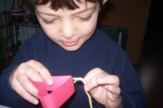 To make things easier for him, I cut up strips of red, pink, and white construction paper and had him roll it up and glue it end to end.